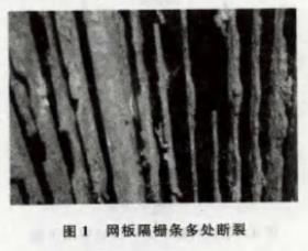 膠球清洗裝置的收球網(wǎng)安裝位置上游直管段長度大于循環(huán)水管直徑的3倍,以避免循環(huán)水流場對收球網(wǎng)的干擾。收球網(wǎng)直接安裝在凝汽器出水口彎管段下游,容易造成A側(cè)膠球清洗裝置收球網(wǎng)網(wǎng)板(簡稱網(wǎng)板)積球;網(wǎng)板隔柵條多處斷裂并扭曲變形,導(dǎo)致膠球可從隔柵條空隙中擠出,影響裝置收球率;由于網(wǎng)板本身缺陷造成與殼體周邊間隙過大會導(dǎo)致漏球(圖1、圖2)。
