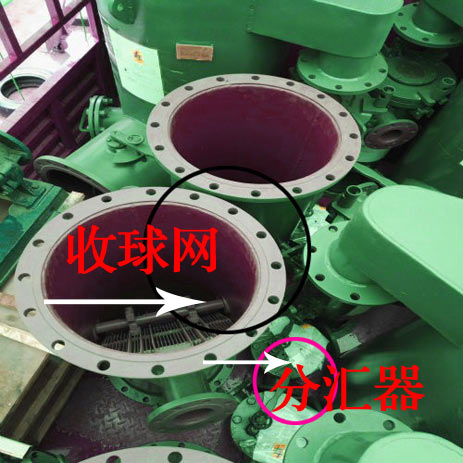 分匯器是一個三通閥,通過導向板的切換可使膠球進入需要清洗的一側凝汽器中工作。一般一臺機組需兩臺分匯器,其進口通徑為DN100,分配口為DN89,膠球投用時可通過窺視窗觀察運行情況。