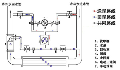 冷凝器清洗適合選全自動(dòng)在線膠球清洗裝置安裝指導(dǎo):在冷卻水循環(huán)管路上,加裝由發(fā)球器、收球器、控制器等管路系統(tǒng)組成的旁路,通過發(fā)球器將膠球注入冷凝器內(nèi),在系統(tǒng)自有壓力的作用下,對(duì)冷凝器銅管內(nèi)壁的污垢進(jìn)行自動(dòng)清洗,在出水口端由收球器將膠球?yàn)V回至發(fā)球器,形成一次完整的清洗循環(huán)。通過控制系統(tǒng)可設(shè)定清洗頻率,實(shí)現(xiàn)自動(dòng)在線清洗功能,使冷凝器銅管內(nèi)壁始終處于清潔狀態(tài),提高了換熱效率,并降低了能耗,從而達(dá)到節(jié)約能源的目的。