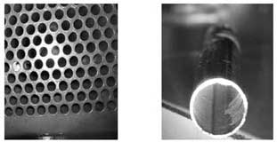 1)現場檢查情況見圖,其中的凝汽器的TP304不銹鋼管內壁結垢普遍,呈深灰褐色,個別管結垢呈淺藍色或褐黃色;對凝汽器換管隨機割管,管內水垢分兩層結垢,外層疏松易脫落;內層結垢緊密,質地堅硬,內層水垢呈灰白色;