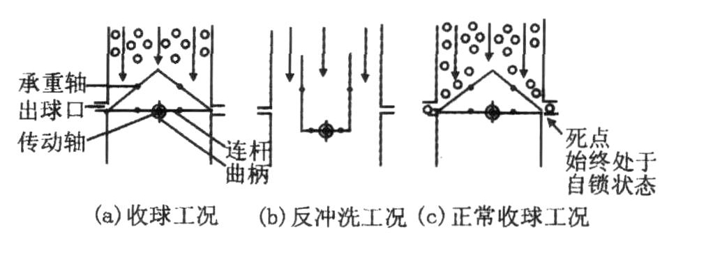 收球網與筒體密合力大,機構自鎖,可靠地實現了功能。傳動軸和承重軸分開,受力合理。采用鉸鏈四桿機構,在兩個極限位置時連桿與曲柄共線,為機構死點位置,機構自鎖,此時,不論加在網板上作用多大的力,則網板不會移動,可靠實現收球和清洗功能。