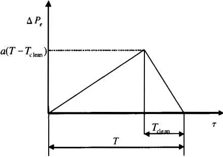 通過測取機組清潔率隨時間變化的曲線,就可以得到由于臟污使汽輪機排汽壓力Pc隨時間的變化關系。即:p,-=fM, 其中,岳為汽輪機排汽壓力,Pa。由汽輪機功率Pe隨排汽壓力變化關系曲線,得:P哉(公),⑵結合式(1)和式(2),可以得到由于臟污所引起的汽輪機功率隨時間的變化式:ARHS),⑶其中,△四為臟污所引起的汽輪機功率的變化值,kWo當清洗系統投入運行時,污垢的清除也是逐漸進行的,隨著清洗過程的繼續,由臟污所造成的損失逐漸減小,直至清洗時間K噸后,臟污所引起的損失達到零,在清洗過程中汽輪機功率隨時間的變化式如下。AF"),⑷其中,Ape為在清洗過程中汽輪機功率的變化值,kW0為簡化計算,在不長的時間間隔內,可以將功率損失曲線近似作直線處理,如圖1所示。